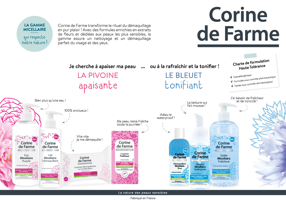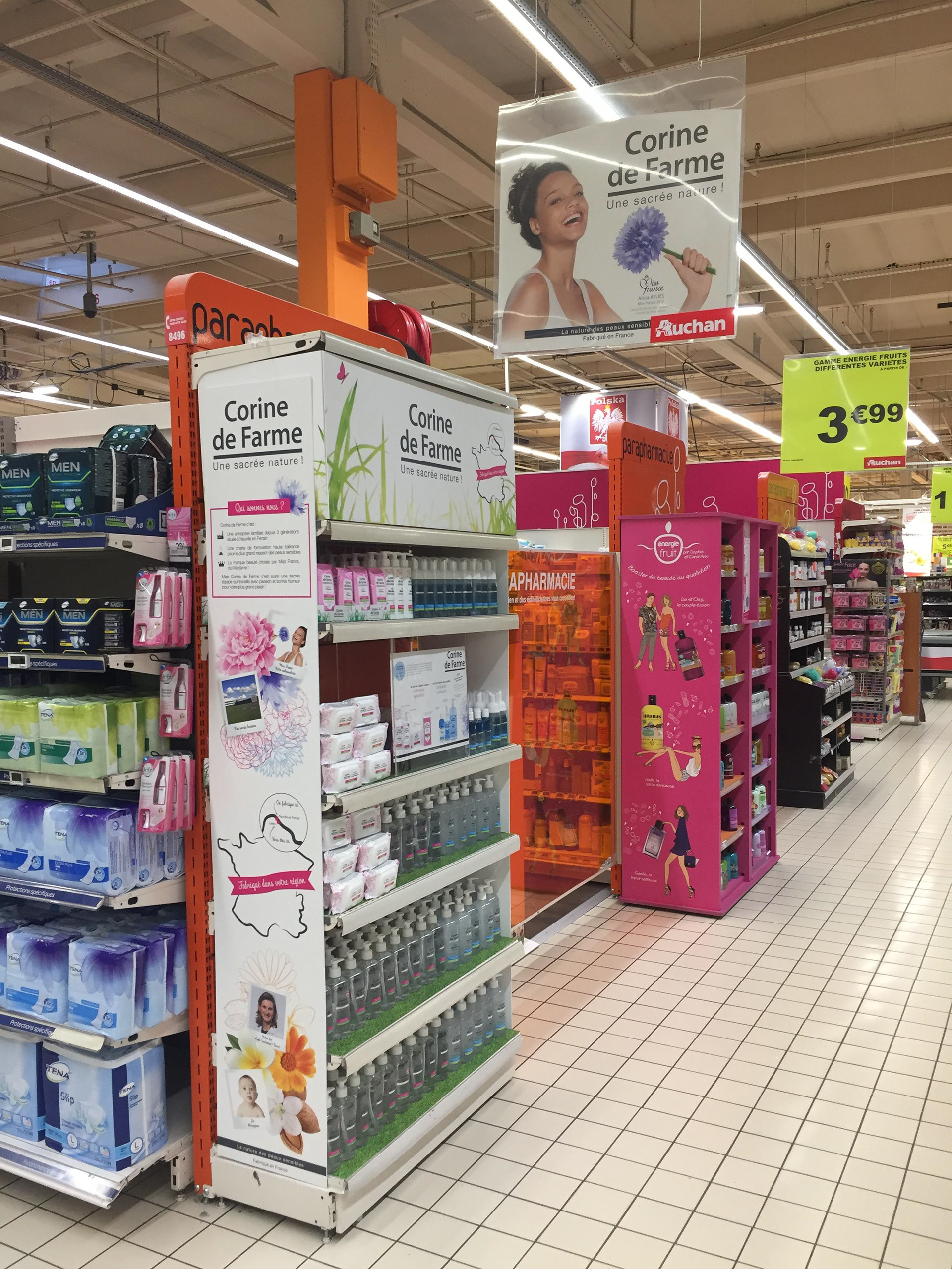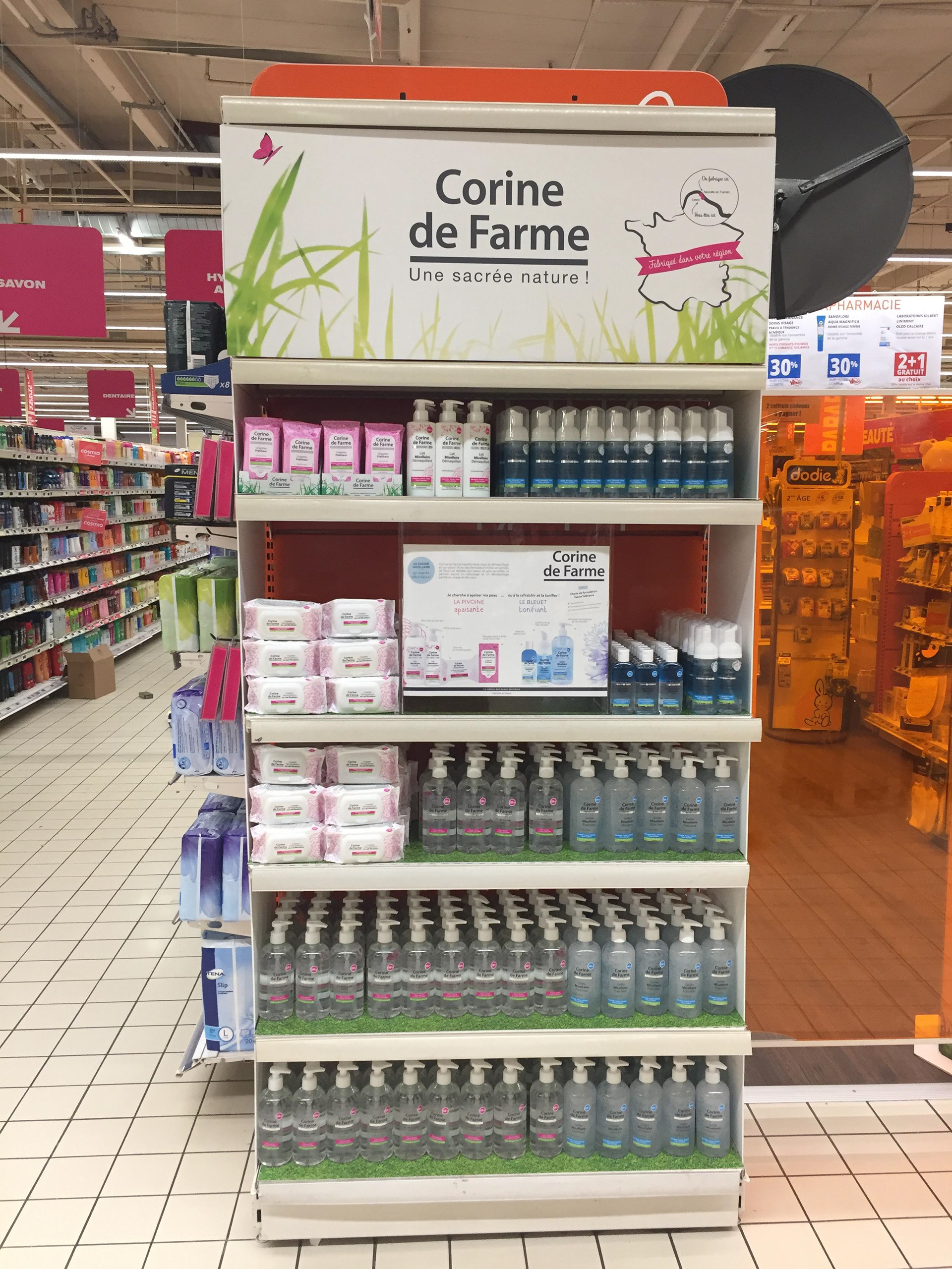 Entreprise familiale française implantée dans le nord de la France depuis trois générations. La marque Corine de Farme souhaite développer un axe de proximité avec ses consommateurs car peu d'entre eux en sont informés. Dans le cadre d'un développement de partenariat privilégié avec Auchan Leers, le souhait exprimé : obtenir une tête de gondole permanente pendant un an dédiée à la marque selon des temps forts définis.